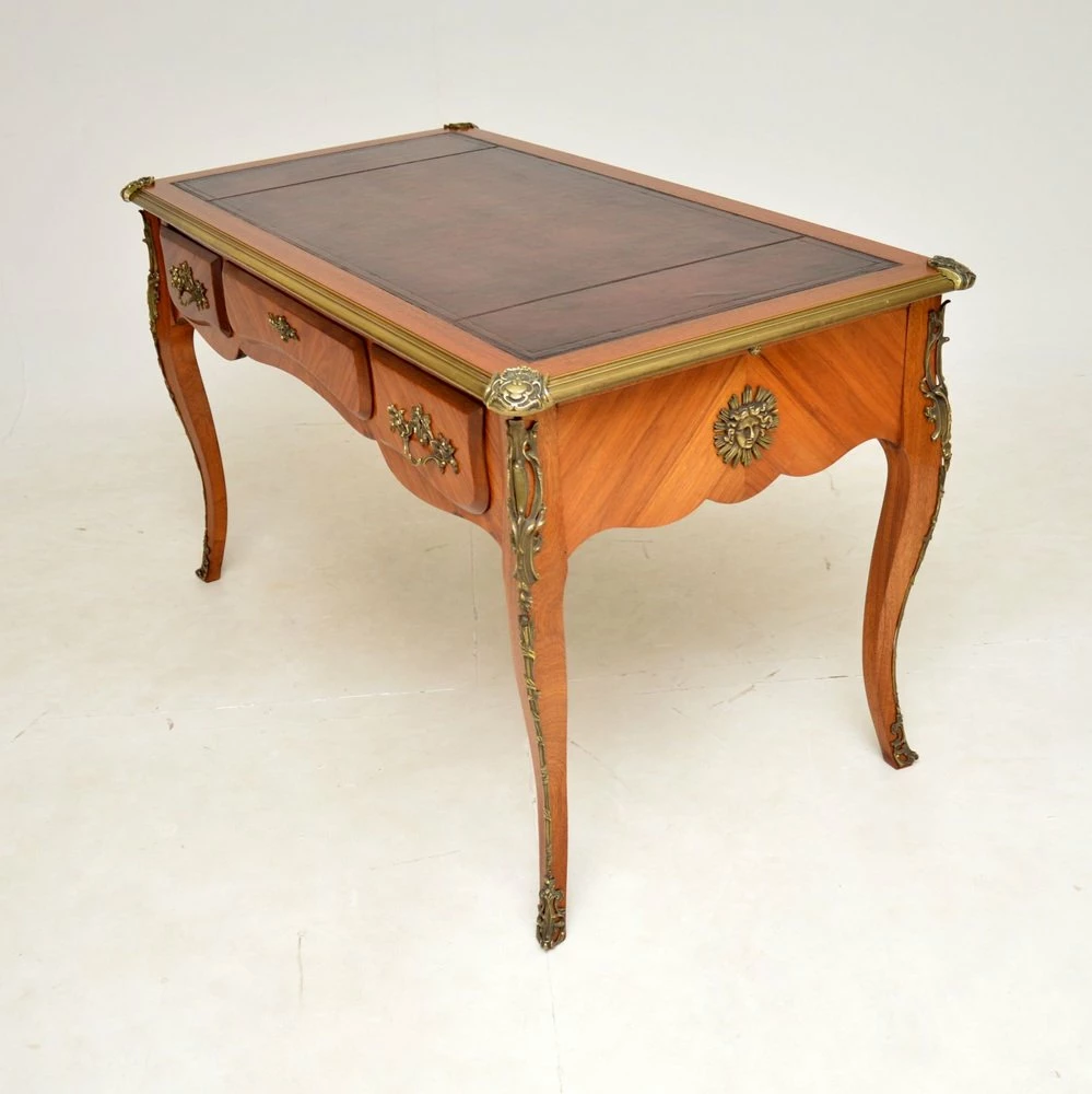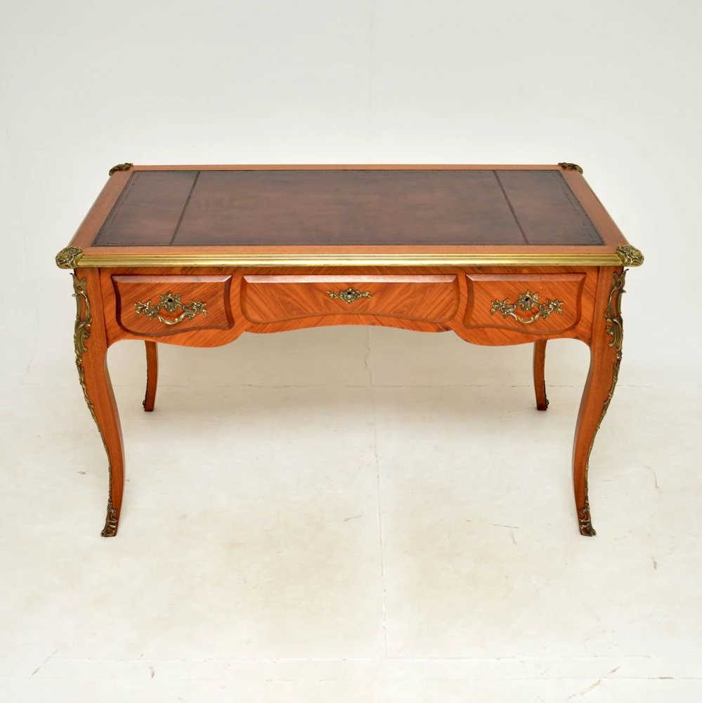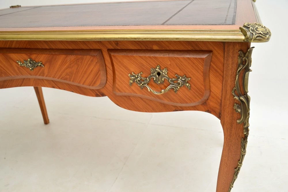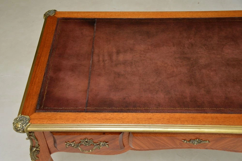 The quality is outstanding, this is a great size, with lots of nice features. The burgundy leather top is hand coloured and gold tooled, in addition there are two pull out leather top slide shelves that come out on each side. There are fine quality gilt bronze mounts throughout, this has dummy drawers on the back and looks identical on both sides, so it is designed to be free standing. The wood has a gorgeous colour tone and beautiful grain patterns.