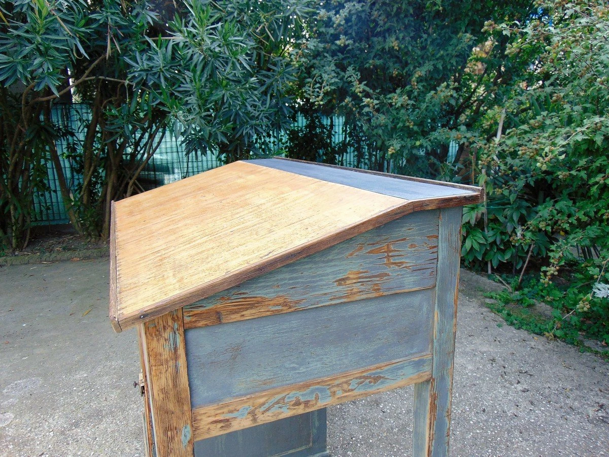 Industrial work desk all in wood with oblique drawing top, large drawers.