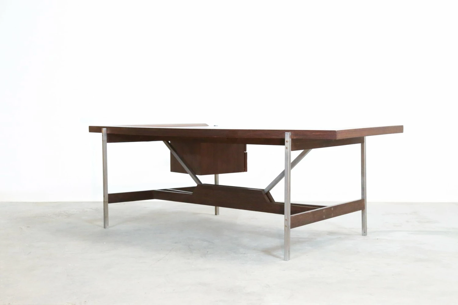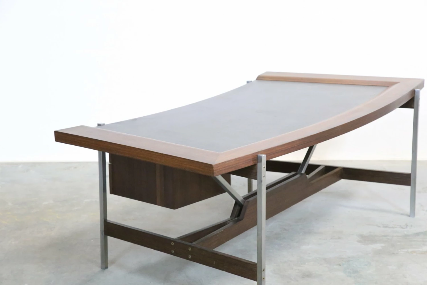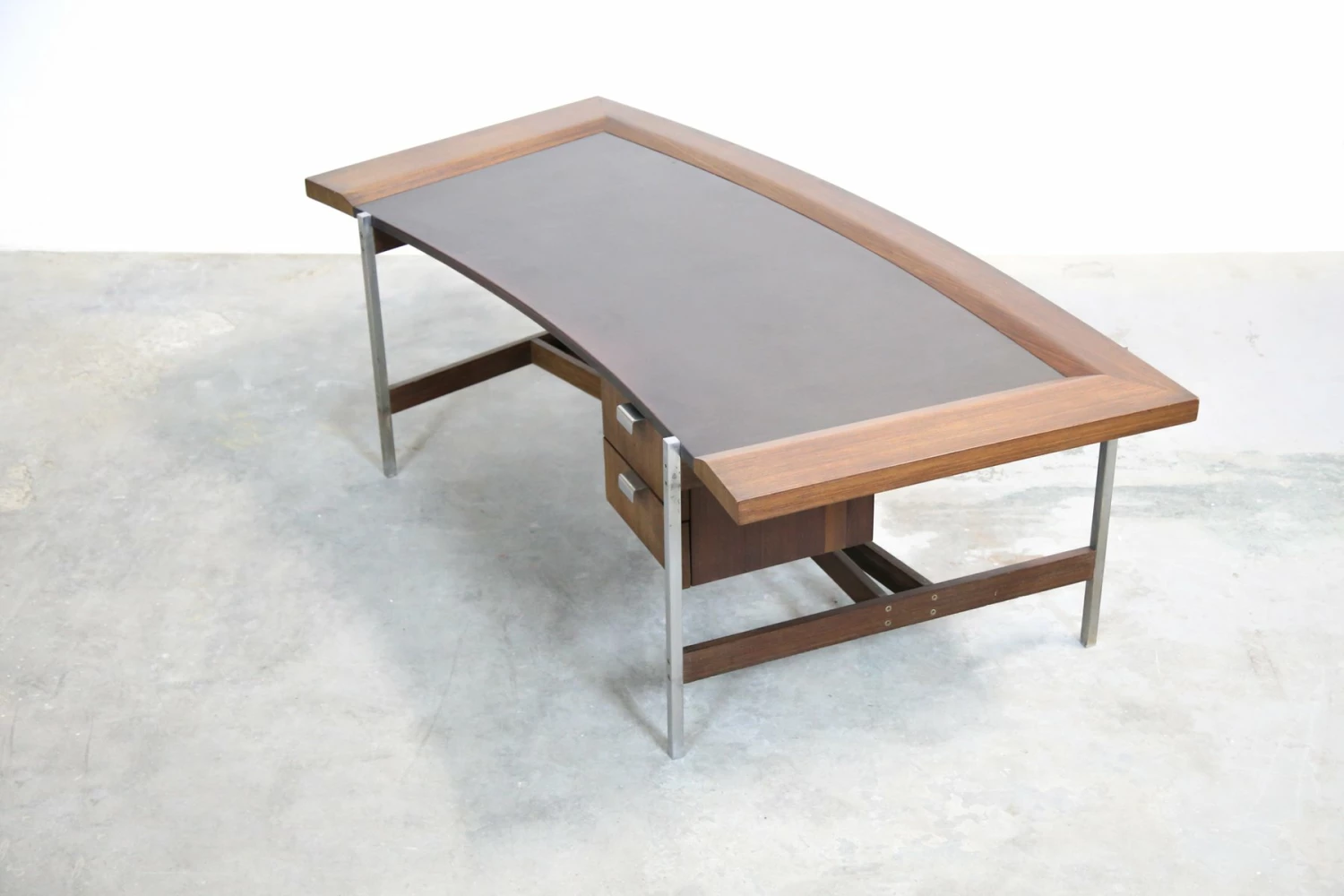 This modernist office desk is made from rosewood and steel with a slightly curved table top desk.