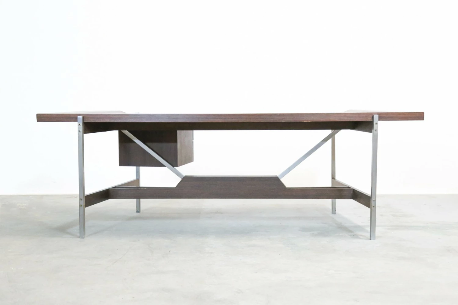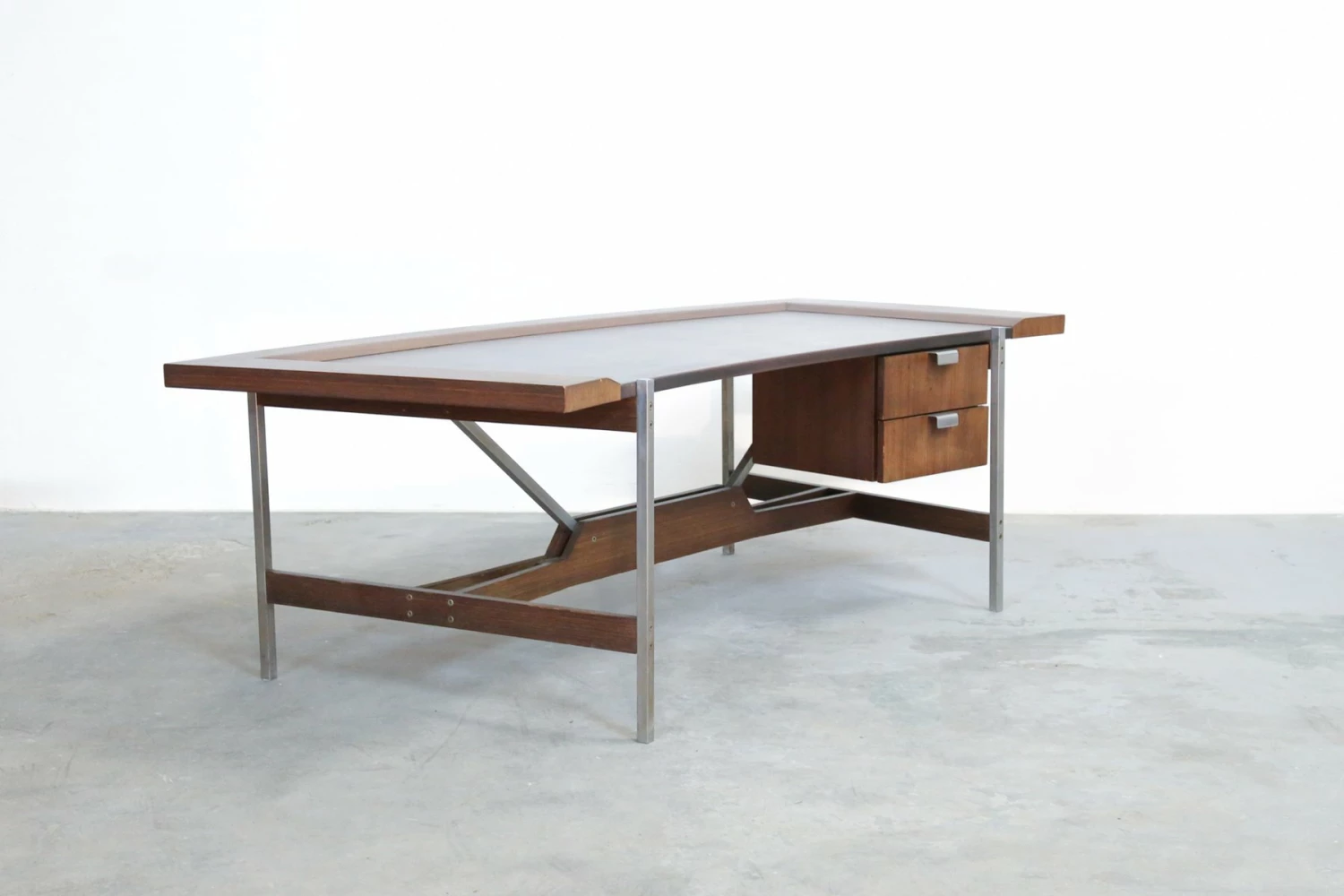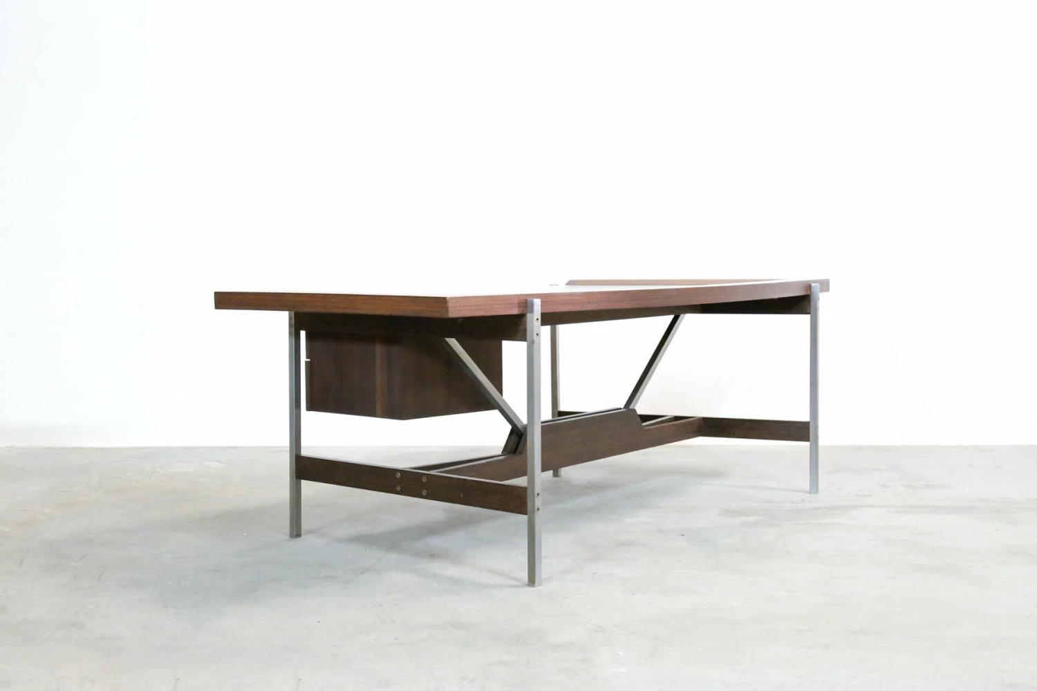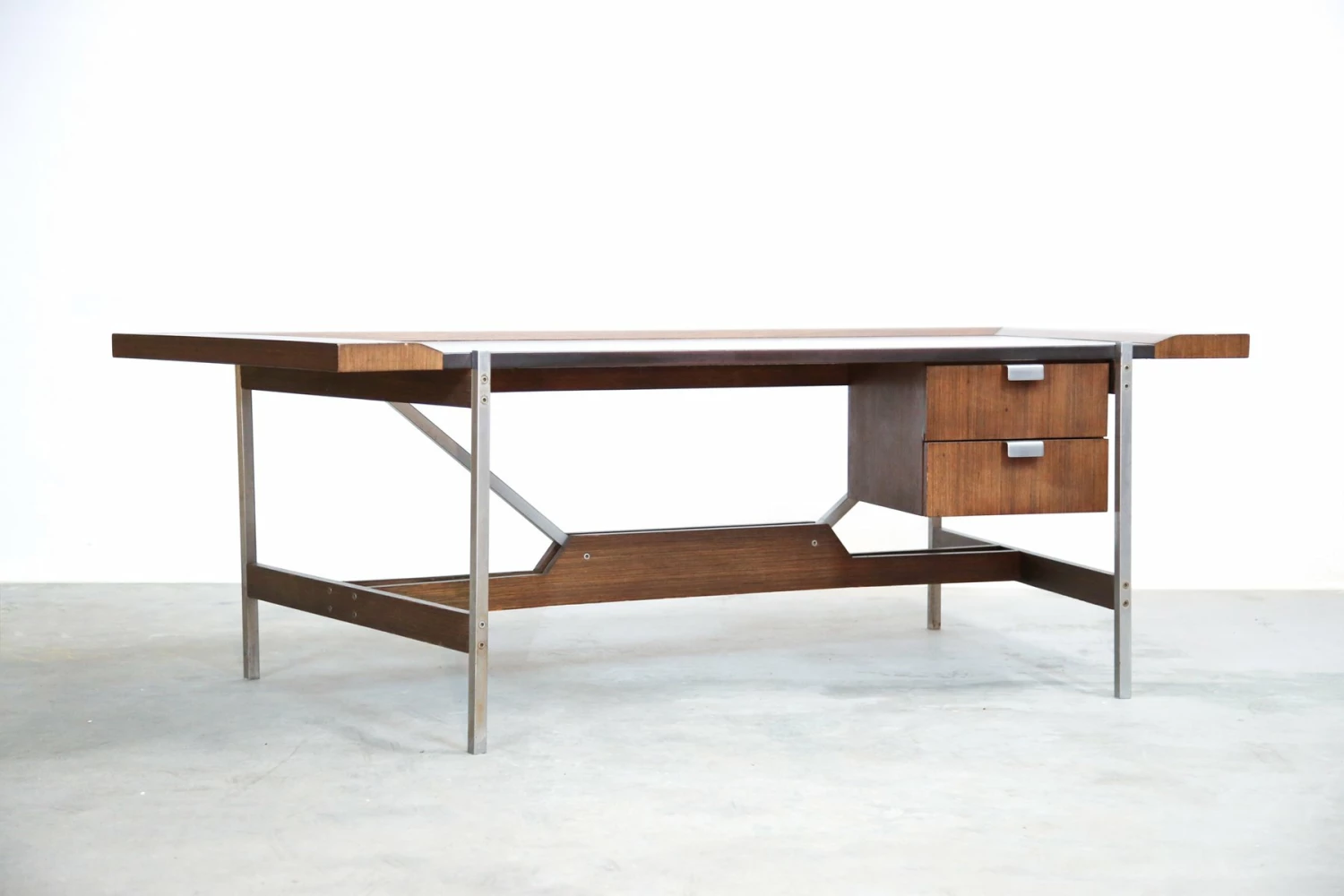 This modernist office desk is made from rosewood and steel with a slightly curved table top desk.